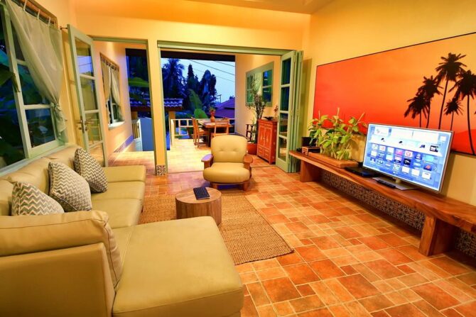 Двухуровневая вилла Maeve окружена тропическим садом и расположена в посёлке Бопхут. Гостям предлагается Free Wi-Fi. В распоряжении арендаторов 3 спальные комнаты, обставленные деревянной мебелью из богатых пород, зал с современной системой мультимедиа, кухонная площадь оборудована всей необходимой бытовой техникой, а также имеются две обеденные зоны, под крышей и на воздухе.