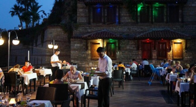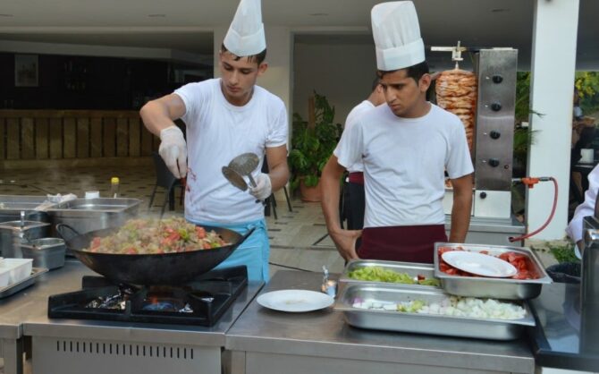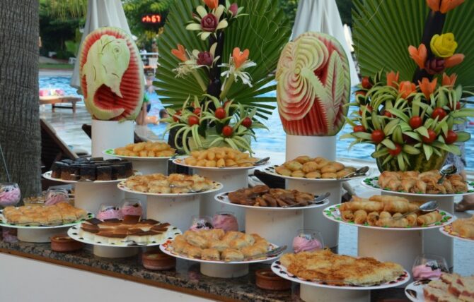 Здесь постояльцы проживают по принципу «все включено». Эта система работает круглосуточно, поэтому в любое время дня и ночи доступны отдыхающим еда и напитки как алкогольные, так и безалкогольные. На завтрак, обед и ужин сервируют шведский стол. Большое разнообразие блюд включает европейскую, международную и местную турецкую кухни. Большой выбор сыров, овощей и фруктов, мяса, морепродуктов, десертов и выпечки. Есть отдельная карта диетического, детского и вегетарианского питания. Для детей также предоставляется стульчик, чтобы было удобнее кормить.