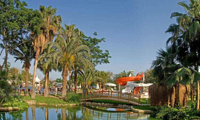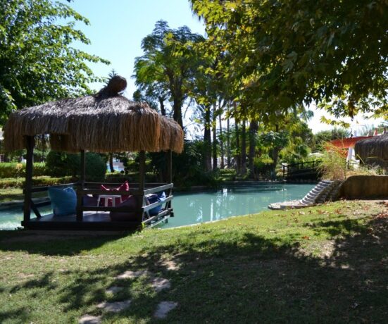 Еще здесь есть собственный пруд, вокруг которого стоят беседки, где можно насладиться близостью природы и послушать пение птиц. Необыкновенно красивый мостик перекидывается через это озеро. Помимо красивой природы, здесь также есть большой амфитеатр, где аниматоры проводят яркие представления и красочные шоу-программы.