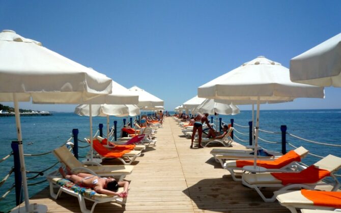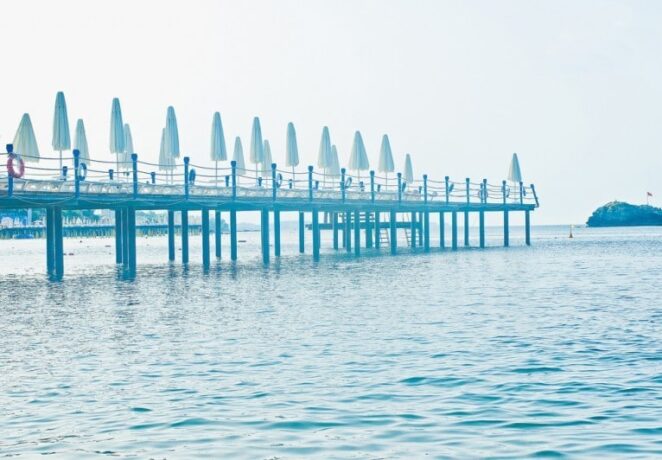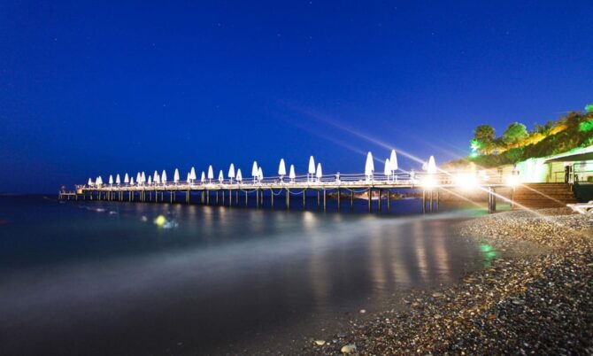 Здесь есть собственный небольшой, но чистый залив. Пляж покрыт мелкой галькой. Его протяженность – 200 метров. Заход в воду довольно удобный, пологий, комфортный даже для малышей. Есть красивый пирс с ночным освещением. Шезлонги с матрасами и зонтами доступны в свободной форме для постояльцев. Очень удобно еще то, что здесь есть душ с пресной водой.