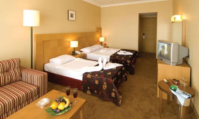 Во всех апартаментах есть ванная комната с туалетом, но только в семейных пенатах ванна, в остальных – душевая кабинка. Все спальни оснащены кондиционером или сплит-системой, современным телевизором, телефоном, холодильником с мини-баром, сейфом, телефоном и феном. В мини-баре бесплатная вода, остальное – за отдельную плату. Бесплатный Wi-Fi только в холле и лобби, в комнатах – платный.