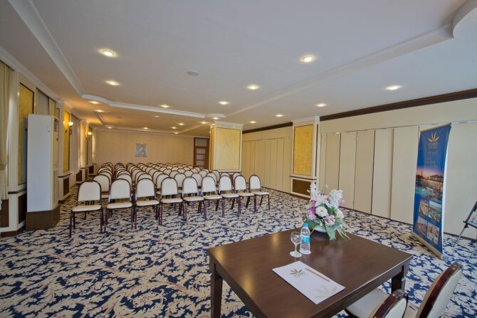 Для проведения важных мероприятий, деловых переговоров. Конференций и семинаров можно воспользоваться конференц-залом. Персонал подготовит помещение с современным декором, новой техникой и коктейлями для гостей. Зал вмещает 150 человек, а сцена – 100. Предоставляется микрофон и качественная звуковая система.