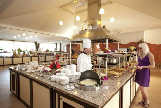 Официанты и бармены быстро обслуживают, меняют скатерти, убирают грязную посуду и регулярно заполняют линию раздачи продуктов. Мороженое детям выдают в определенное время, но порций на всех хватает.