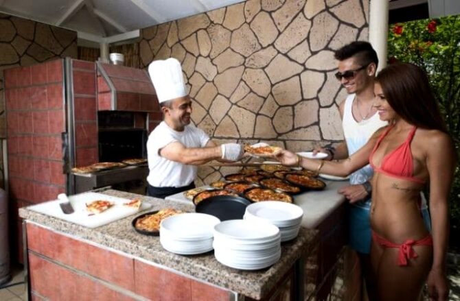 Полакомиться фастфудом всегда можно в баре на пляже. Там предлагают вкусную пиццу, бургеры, картошку и другие быстрые закуски. На ужин здесь готовят на гриле шаурму, крылышки, рыбу и многие разновидности мяса.