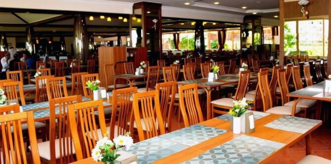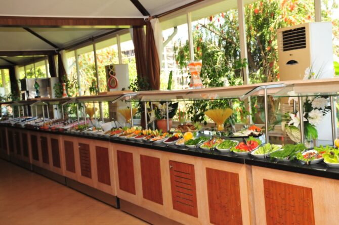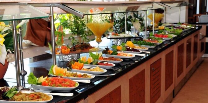 Aydinbey gold dreams работает по системе «все включено». В основном ресторане накрывают стол для шестиразового питания. Есть детское и диетическое меню. Гости отмечают, что лучше приходить на час позже начала, чтобы не стоять в очереди за едой и не тратить время на поиски свободного столика. Малышам выдают детский стульчик для кормления. В перечень блюд входит первое, гарниры, холодные закуски, фрукты, овощи, десерты, разные виды мяса.