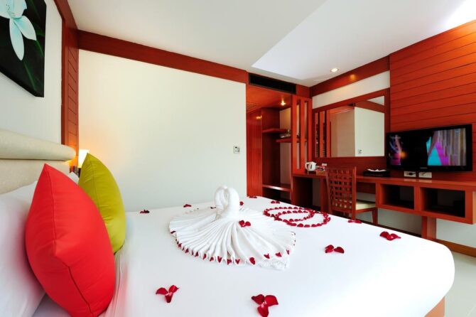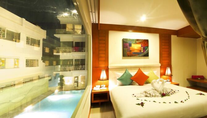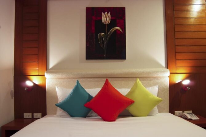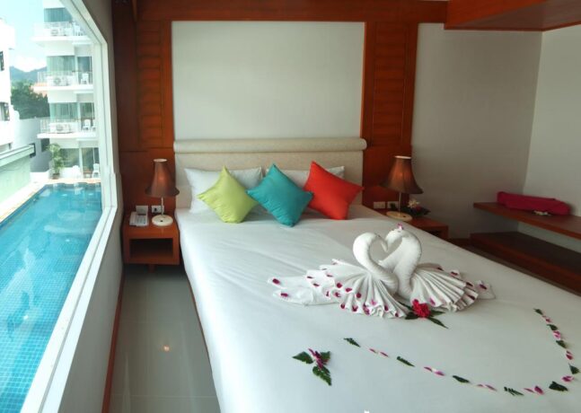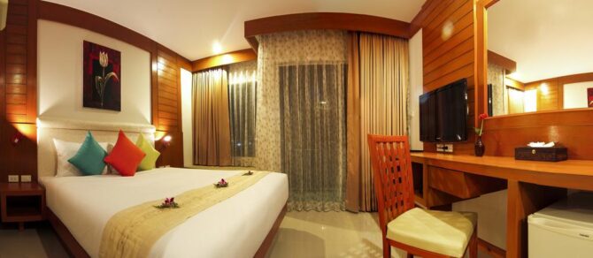 Удобные номера, отзывчивые работники, вкусная еда – это основные преимущества в пользу выбора именно этого пансионата для отдыха в Таиланде. Пляж Карон, который находится в шаговой доступности, муниципальный, не принадлежит отелю. Зонты и лежаки на нем платные. Но возле гостиничных бассейнов все это бесплатно. Можно взять вкусный коктейль в баре и прилечь под навесом на мягком лежаке.
