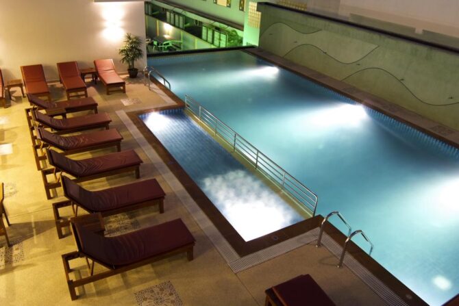 Второй находится на втором этаже пятого корпуса. Он довольно уютный. Из некоторых номеров можно выходить к нему прямо с балкона. Окруженный зданиями, этот водоем отличается относительной тишиной. До этого места не доносится шум со стороны дороги. Для детей есть мелководная часть с заборчиком, чтобы малыши не могли самостоятельно перебраться на глубину. С одной стороны бассейна – краники, по которым вода течет в котлован.