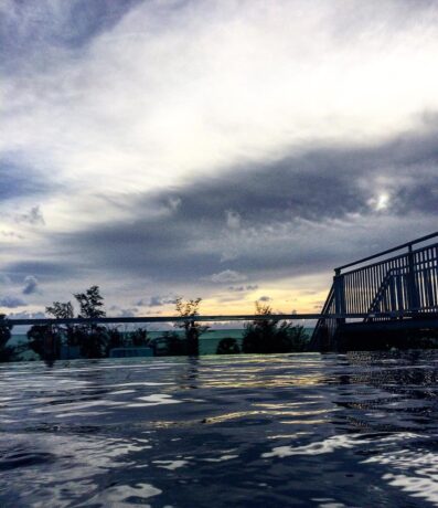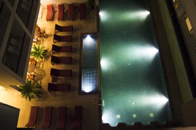 Третий тоже расположился на крыше, в первом корпусе. Мягкие лежаки, зонтики и небольшой навес располагают к приятному отдыху у воды. Помимо лежаков, здесь есть столики и стулья, можно полноценно перекусить, заказав еду в баре. Глубина разная. Вода очень чистая, поэтому можно увидеть, где какая глубина.