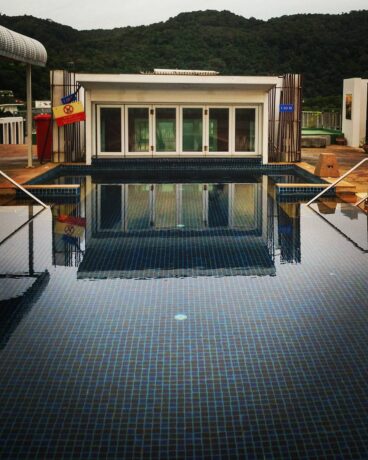 Отдельно стоит отметить количество водоемов на территории пансионата. Всего здесь 3 бассейна. Они разные по глубине, размерам и функционалу. Один находится на крыше четвертого корпуса. Он достаточно глубокий, с детским участком и джакузи с удобными ступеньками, по которым комфортно спускаться в основной котлован. По периметру водоема расставлены мягкие лежаки, играет легкая приятная музыка, а в воздухе витает соленый аромат океана. Кроме того, рядом работает бар.