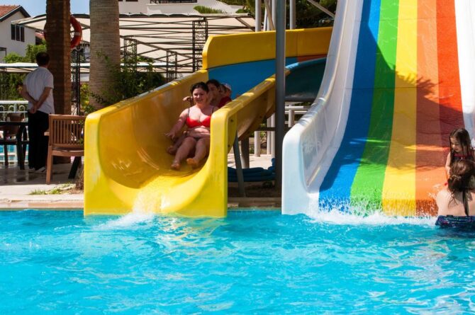 Днем вы всегда можете насладиться отдыхом возле бассейна. Здесь есть бар с вкусными напитками, шезлонги, зонтики, водные горки, раздевалка со шкафчиками.
