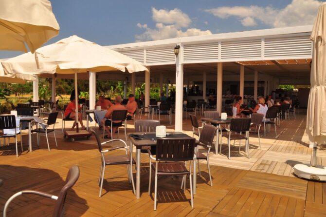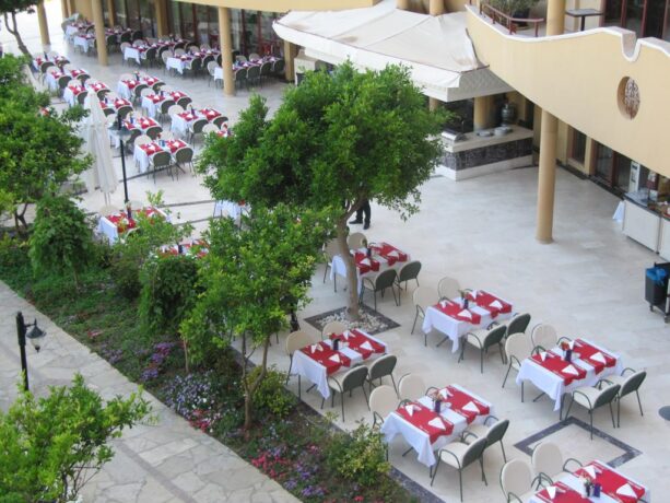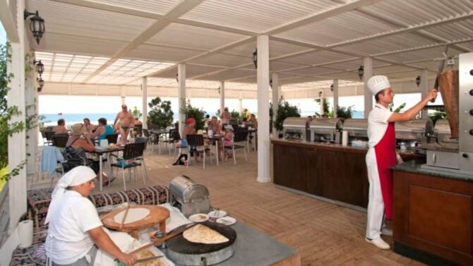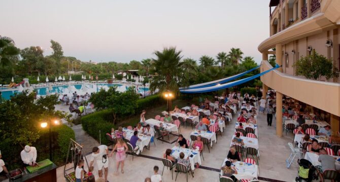 Завтрак, обед и ужин входят в стоимость заселение по формату «все включено». Питание проходит по системе шведского стола. Ассортимент включает турецкую, европейскую и мексиканскую кухни. Едой SPA-комплекс обеспечивают собственные столовые. В комплексе есть четыре закусочных. Основные блюда представлены теми же, что и на шведском столе. В бистро можно вкусно поесть, в меню имеется много деликатесов. Среди блюд преобладают морепродукты и итальянские соусы. Столовая прекращает работу после полуночи. Из алкоголя, входящего в стоимость путевки – пиво, водка и вино.