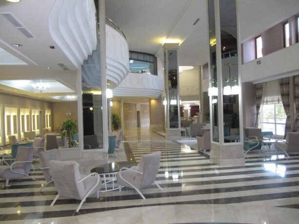 У морского побережья расположен пансионат на 250 номеров. В холле встречает персонал и проводит регистрацию, внутри два больших дивана для ожиданий, камера хранения, обменник валюты и банкомат. Можно заказать такси, газету или просто позвонить. Посетителям предоставляется интернет.