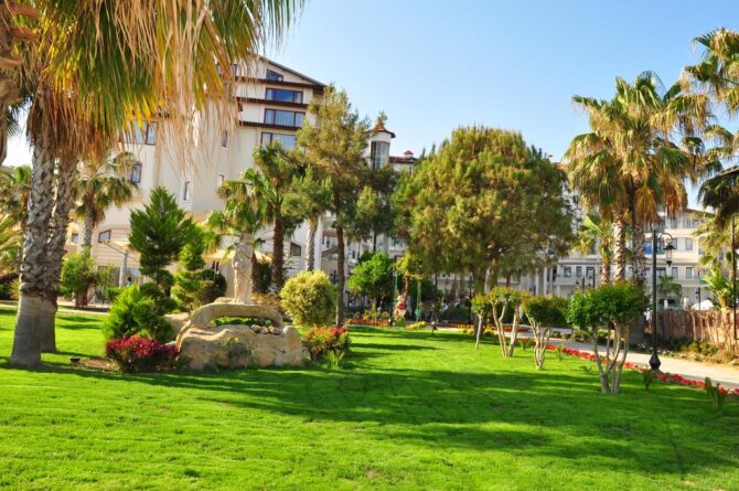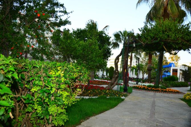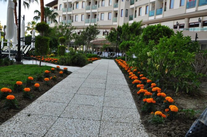 Территория Bella Resort 5*, а это более 23 000 кв. м., вся утопает в зелени. Красивые и ландшафтные цветники гармонично вписываются в общую архитектуру, и за ними постоянно ухаживают. Сотрудники SPA-комплекса следят за чистотой по всему комплексу.