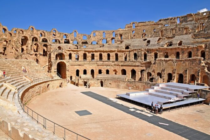 - Колизей в Эль-Джеме – римский амфитеатр напоминает римский колизей и ничуть не уступает ему по масштабности и величию. Сюда едут, чтобы представить себя храбрым гладиатором на арене и восхититься древними постройками.