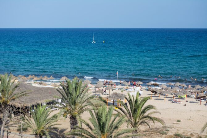 Благодаря удачному расположению климат на тунисских курортах совсем средиземноморский – жаркое, но комфортное лето с морскими бризами, мягкая и теплая зима. Купальный сезон длится с мая по октябрь, учитывайте это, если собираетесь организовать пляжный отдых.
