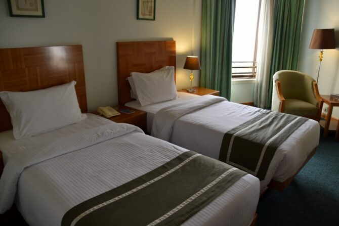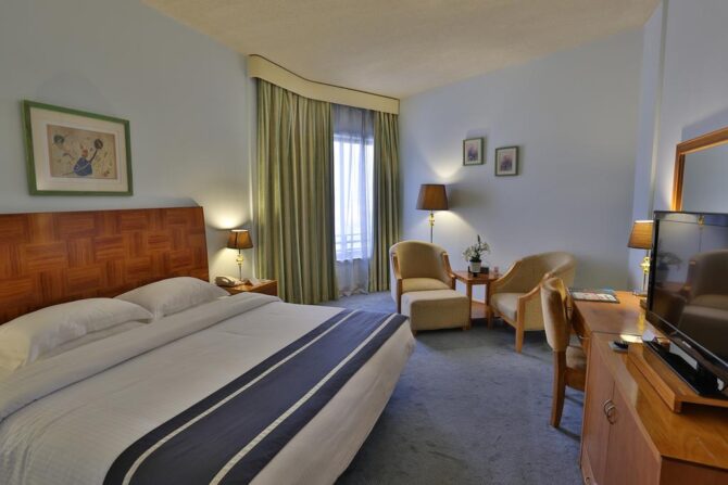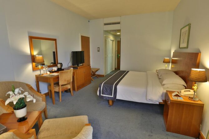 - Стандартные. В помещениях есть удобная спальная зона, мягкий уголок, телевизор, кондиционер, письменный стол, телефон, шкаф и сейф. Большие сумки с купленными сувенирами или одеждой можно оставить в камере хранения, чтобы не захламлять свободное пространство номера. Общая площадь – 23 квадратных метров.