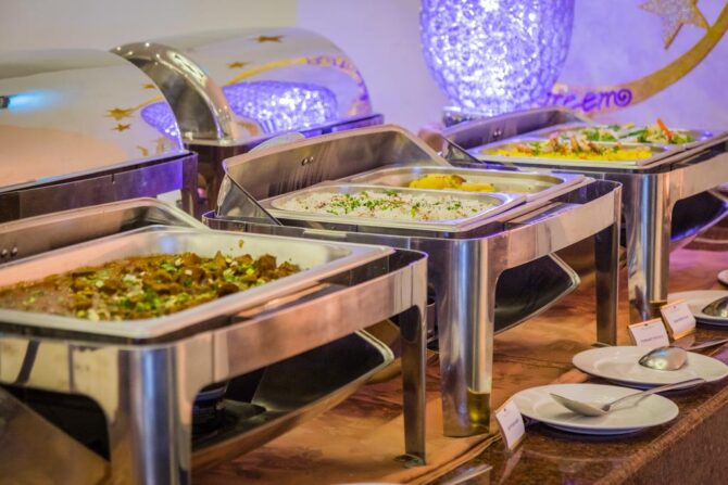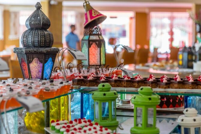В туристическом комплексе Bin Majid Beach Hotel разработано несколько вариантов питания – это континентальный завтрак, полупансион и полный пансион. Это дает возможность гостям самостоятельно определять и находить оптимальный выбор. Как показывает практика, подавляющее большинство постояльцев все-таки отдает предпочтение системе «все включено». Согласно этой программе все основные приемы пищи будут проходить в главном ресторане по принципу «шведского стола». В течение дня можно заказывать легкие закуски и прохладительные напитки, пирожное, выпечку, десерты, фастфуд и многое другое в одном из многочисленных баров.
