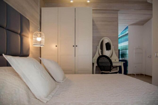 Интерьер помещений бутик-отеля «Мускатель» выполнен в светлых тонах с преобладанием белого цвета. В номерах установлена одна двуспальная или две односпальные кровати. Детская кроватка и стульчик для кормления малышей предоставляются по запросу гостей. Кровати оборудованы ортопедическими матрасами. Каждый номер любой категории включает набор удобств, необходимых для комфортного проживания и отдыха: