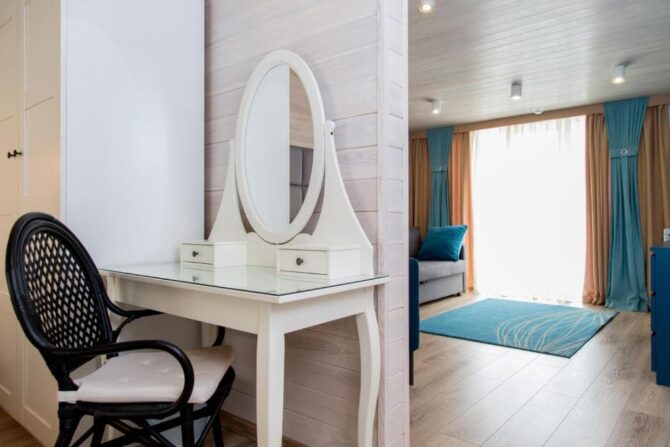 Номера второго и третьего этажей оборудованы небольшими балконами. Отдыхая на них за столиками и в комфортабельных креслах, гости бутик-отеля «Мускатель» могут подолгу рассматривать окрестности с живописными горными цепями. Ванная комната включает в себя небольшую душевую кабину. Здесь же разложены полотенца и набор туалетных принадлежностей. Гости могут пользоваться феном, тапочками и халатом.