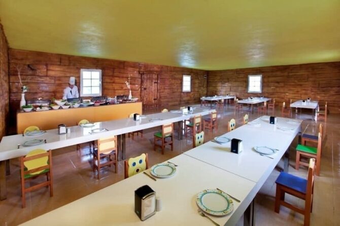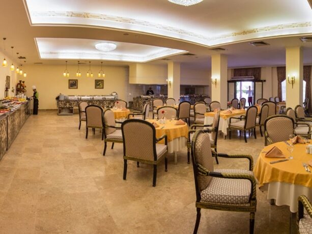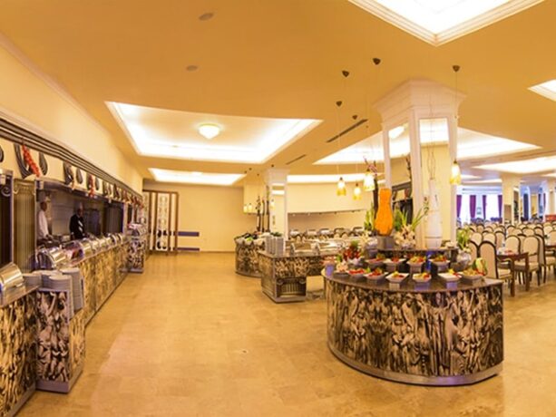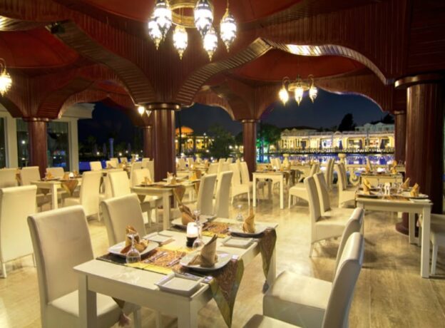 Трижды в день гости кушают в основном ресторане. Здесь всегда накрыт богатый «шведский стол» с блюдами международной и национальной кухни. В огромном количестве здесь готовят баранину, индюшатину, курицу, морепродукты и рыбу. Есть много салатов, в том числе и вегетарианских. На обед всегда подаются супы из свежих продуктов. На столах всегда много десертов, выпечки, фруктов, зелени и овощей.