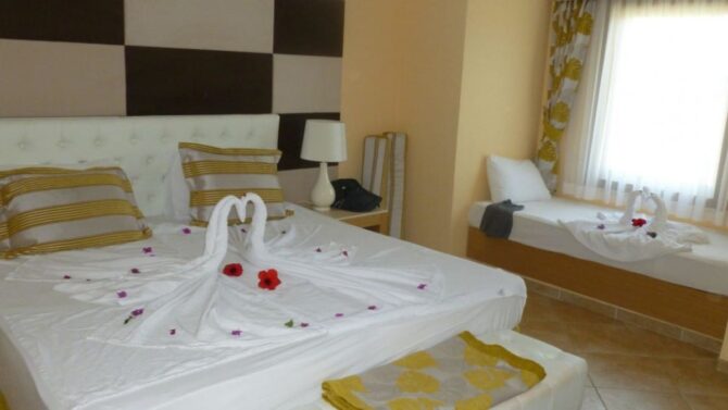 Ксения, г. Ставрополь: «В отеле очень хорошо отдыхать семьей. Заехали мы утром в большие апартаменты для 4-5 человек. По первому же требованию нам предоставили детскую колыбель и установили дополнительную кровать, поскольку мы приехали с тремя малышами. В комнатах не обнаружила ничего отталкивающего и пугающего: обивка мебели чистая, без дефектов, матрасы и подушки не испорчены, покрывало мягкое, на пастели всегда лежат пирамиды из полотенец. Единственное, что меня не устроило – график уборки. Горничная приходила после обеда, когда сынок спал».