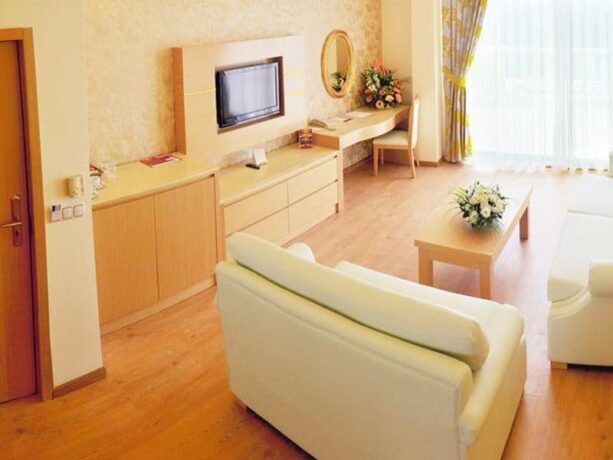 Все помещения дополнены террасами или балконами – это зависит от этажа. Также имеется новая мебель (двуспальная пастель, прикроватные тумбы, шкаф для хранения вещей, небольшая зона отдыха с диваном и журнальным столиком), из оборудования установлены кондиционер с индивидуальным пультом управления, телевизор, телефон, холодильник, в котором регулярно обновляются прохладительные напитки. В стоимость входит использование фена и гигиенических принадлежностей. Обслуживание ведется круглосуточно и совершенно бесплатно.