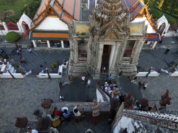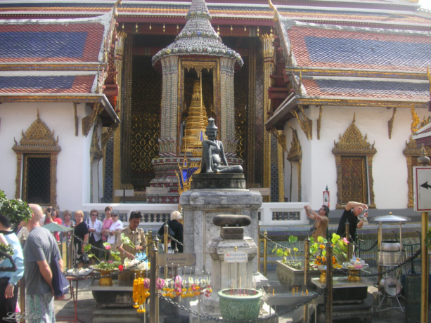 «На посещение Королевского дворца у нас ушло более 2 часов. Хотелось все не спеша осмотреть, сфотографировать. В первой половине дня здесь не так много туристов, как после обеда, поэтому мы угадали со временем. Интересный ритуал перед входом в Храм Изумрудного Будды – окропление головы водой. Все окунают цветы в большую чашу и брызгают на волосы святую воду».