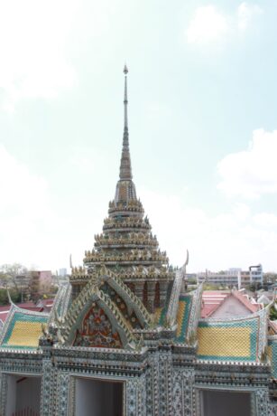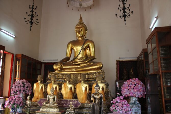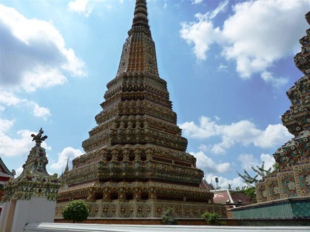 Храм Ват Пхо – великолепное архитектурное сооружение, в котором хранится главная достопримечательность – лежащий Будда. Длина статую – 46 метров, а высота – 15 метров. При строительстве этого культового объекта, сначала была возведена сама фигура божества, а потом вихан с колоннами вокруг нее. Это один из самых старых храмов в Бангкоке, построенный еще в 12 в.