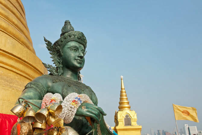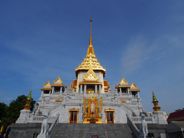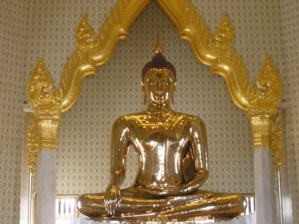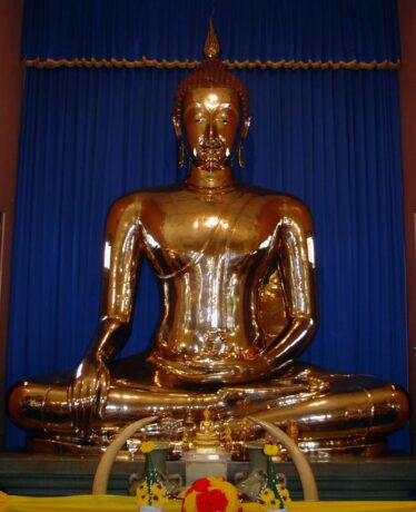 Храм Золотого Будды – еще одна культовая достопримечательность Бангкока. В центре роскошного зала восседает Будда, вылитый из золота с глазами из жемчуга и сапфиров. Весит эта статуя более 5,5 тонн. Свое постоянное место в храме фигура божества обрела в 20 в., хотя история ее началась намного раньше.