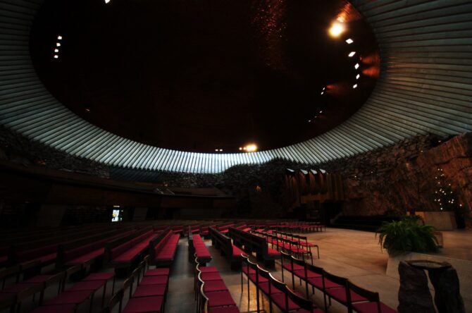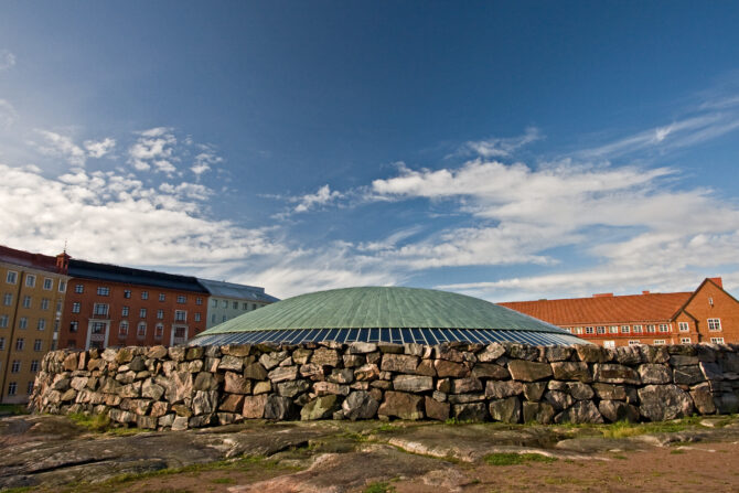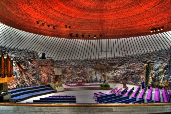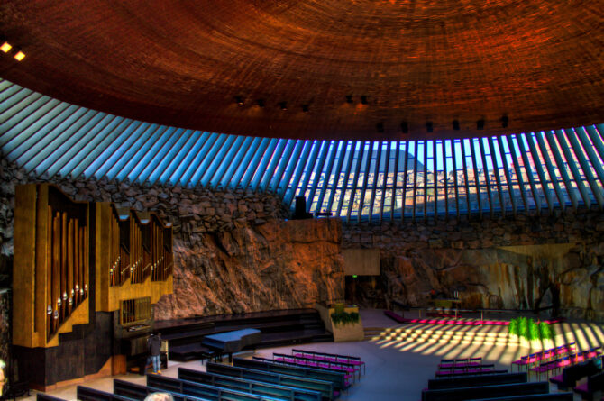 Уникальная достопримечательность Хельсинки, посетить которую стремятся не только верующие люди, но и любопытные туристы. Если взглянуть на церковь Темппелиаукио с высоты птичьего полета, она покажется гигантской летающей тарелкой, а при входе она больше напоминает бункер.