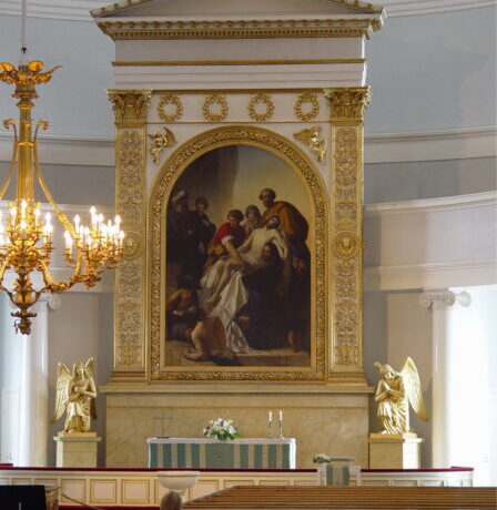 Над строительством собора трудились два архитектора – Энгель и Лорман. Внутреннее убранство храма также лаконично и строго. Алтарную часть украшает большая картина, которую собору подарил российский император Николай II. А туристы, побывавшие в Кафедральном соборе, находят сходство его архитектуры со многими Петербургскими церквями. Также зал украшают скульптуры таких значимых для страны и мира деятелей, как Меланхтоны, Агриколы, Лютера.