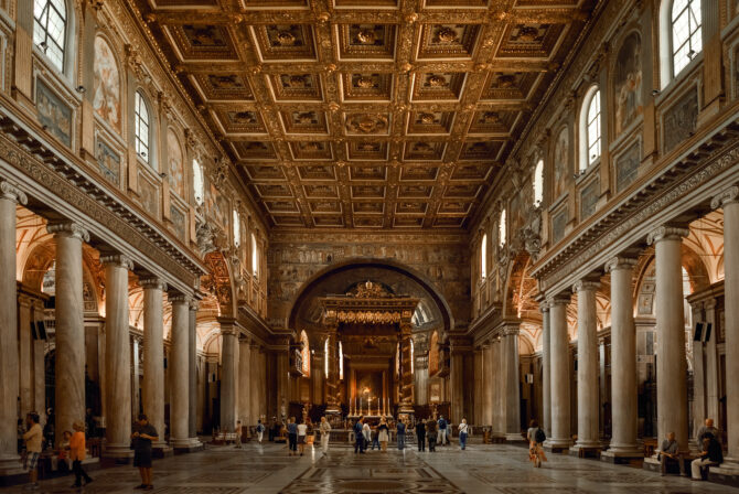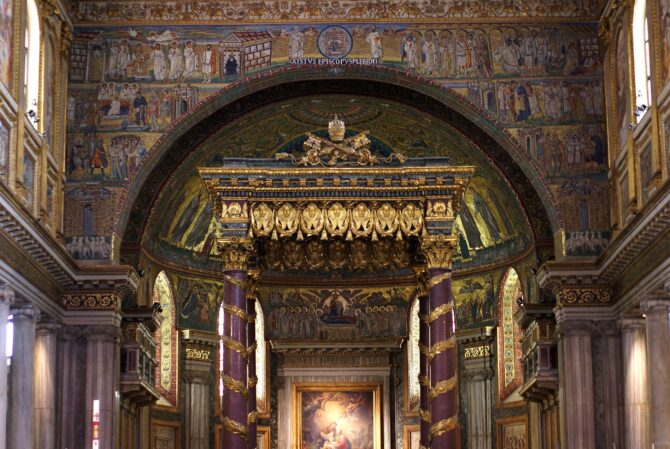 Перед входом в базилику перед туристами предстает 15-метровая скульптура Девы Марии. А внутри стены и потолки расписаны историями Ветхого Завета и библейскими заветами. Сохранились и редкие мозаики. Потолок украшен золотом, которое доставлялось с рудников Америки на кораблях Колумба. Посетить эту достопримечательность Рима можно по адресу: Roma, Piazza dell’Esquilino, 34.