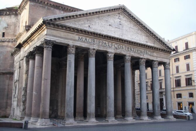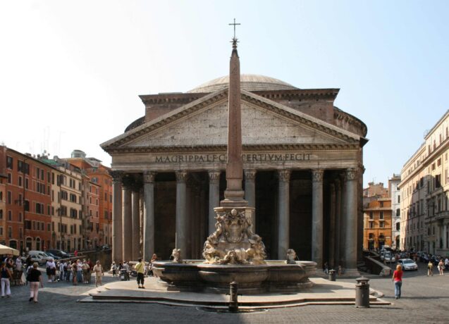 Пантеон – величественный Храм всех богов и, пожалуй, единственное сооружение в Риме, сохранившееся на протяжении многих веков в первоначальном виде. При входе в Пантеон построен массивный портик с двумя рядами монолитных колонн из мрамора и красного египетского гранита.