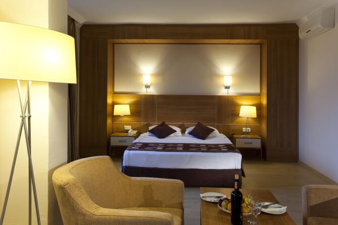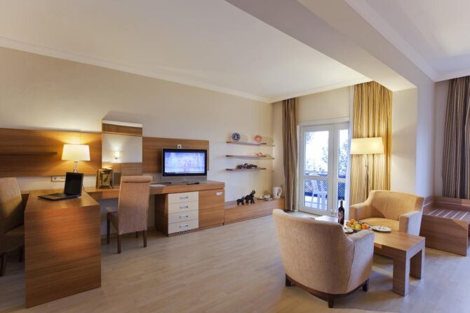 - Сюит занимает 70 м2 и предназначен для посетителей с детьми, так как для них есть отдельное помещение с двумя раздельными спальными местами.
