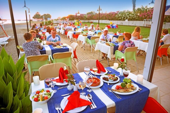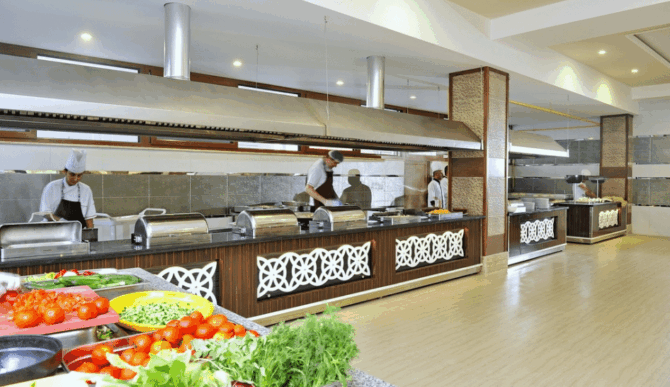 С особым трепетом относятся отдыхающие к питанию в отеле. Здесь предоставляются полноценные приемы по концепции «все включено». Шведский стол разнообразный. Кормят как местными блюдами, так и интернациональной кухней. Основной ресторан располагает двумя огромными залами, способными вмещать себя отдыхающих даже с учетом отсутствия свободных комнат. Один зал в помещении, второй – под открытым небом. Есть возможность принимать пищу, сидя на свежем морском воздухе и слушая пение птиц.