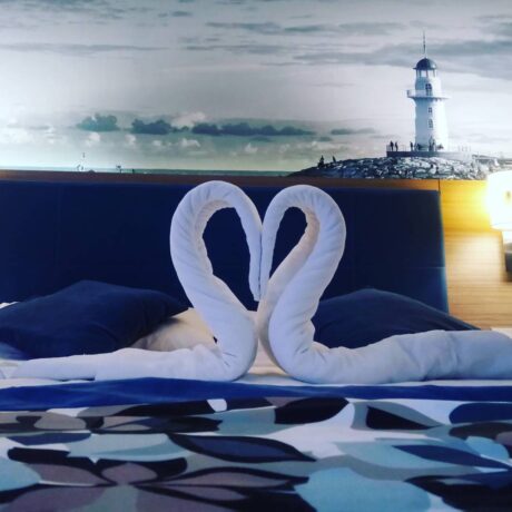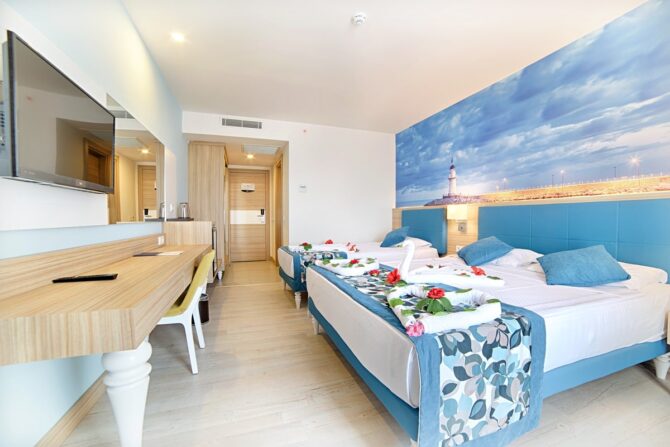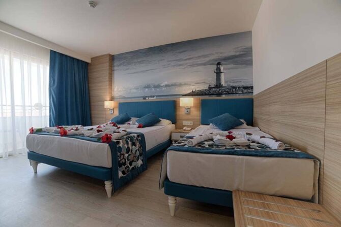 Семейные апартаменты располагают двумя комнатами. В стандартных – одна ванная комната, в Делюкс – две. Балконы и террасы достаточно большие. На них стоят столики и стульчики, поэтому можно вечерами сидеть там и любоваться морем и закатом. Максимальное количество проживающих в одних апартаментах – 6 человек.