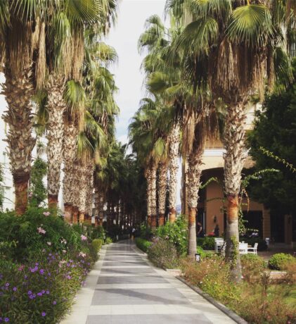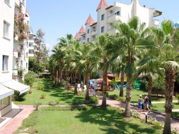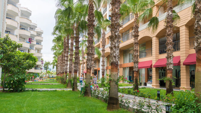 Сама территория комплекса довольно зеленая. Она засажена различными деревьями и раскидистыми пальмами. Под ветвями можно спрятаться от знойного солнца и насладиться тенистой прохладой.