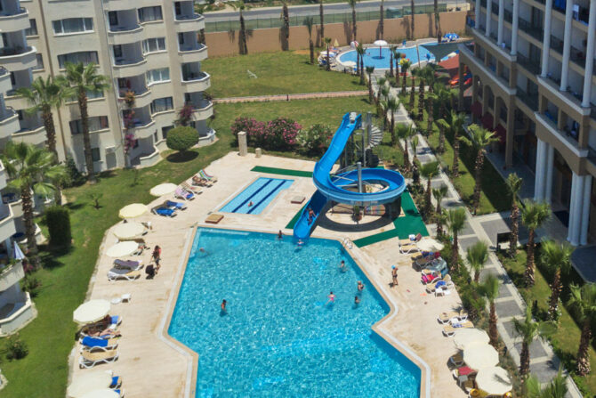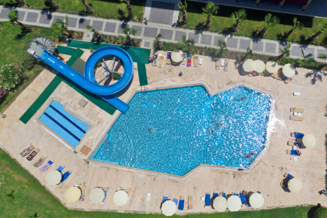 Помимо этого, для постояльцев доступны бассейны, вокруг которых тоже расположены шезлонги и зонты. Всего три пула, из них один – крытый, второй – открытый, а третий — с водяными горками. В них нет подогрева, поэтому в прохладную погоду они могут показаться холодноватыми.