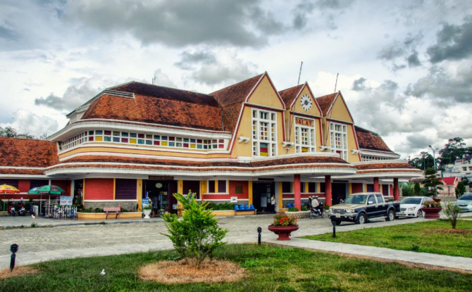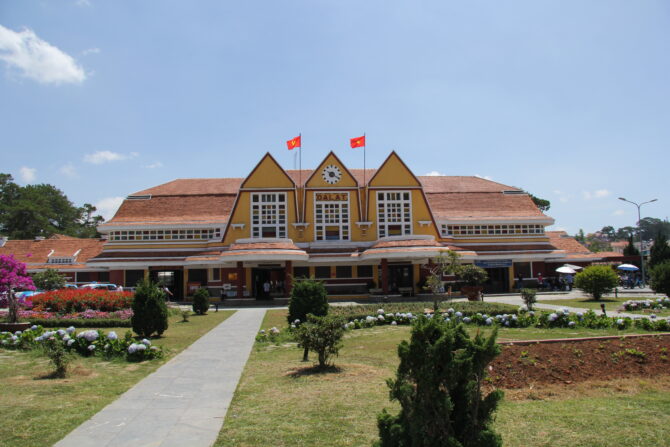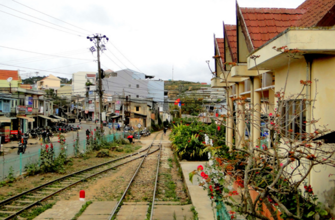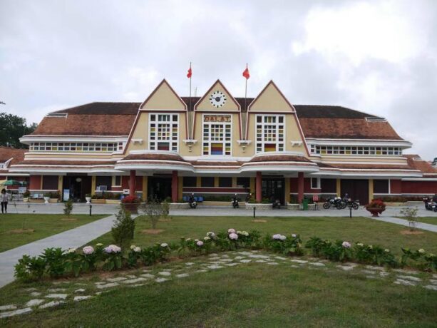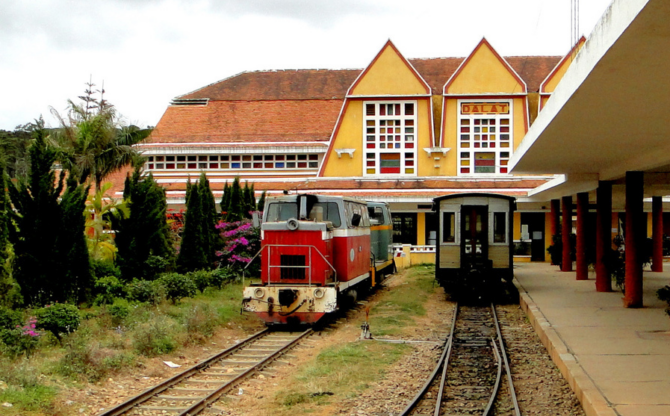 Старинная станция, построенная французскими архитекторами в 1932 году, была признана национальным памятником Вьетнама. Она находится в нескольких сотнях метров от центральной площади. По традиции ее территория украшена цветами, а с платформы можно отправиться в историческое путешествие. Поезд состоит из 3-х вагонов первого, второго и третьего класса. Все места сидячие и отличаются комфортностью расположения по отношению к окнам. Цена билета зависит от класса вагона. На поезде можно добраться до пагоды Линь Хуок, известной, как «Бутылочный храм». Билеты продаются только на ж/д станции. Состав отправляется в путь каждые 2 часа с 7:00 до 18:00.