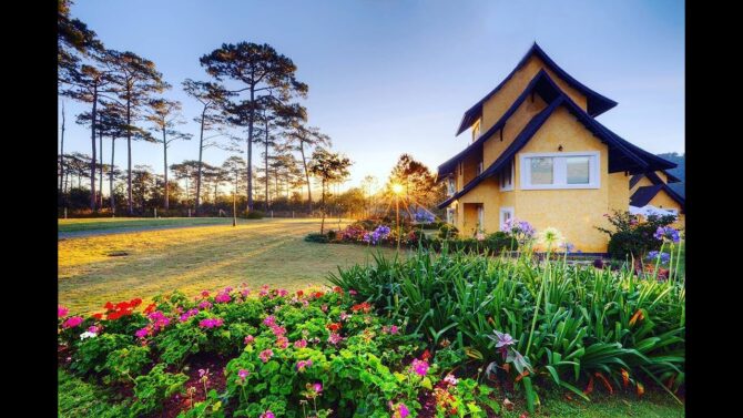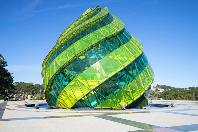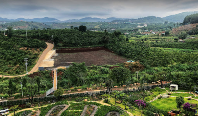 Далат не случайно называют городом цветов. Все улицы, прогулочные зоны и отели украшены клумбами, рабатками и вазонами с цветущими растениями. Центральная площадь Лам Вьен – это ключевой туристический объект города и всей провинции. Она выполнена в форме квадрата и занимает территорию 72 000 м2. Архитекторы разделили ее на 4 зоны, в каждой из которых установлен самобытный арт-объект. В здании, напоминающем огромный артишок, открыта кофейня Doha. Вечером огромная глыба из бутонов артишока, сделанных из стекла и бетона, красиво подсвечивается мерцающим светом. В самом верхнем «бутоне артишока» на высоте 15 м находится панорамное кафе.