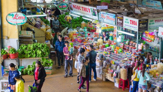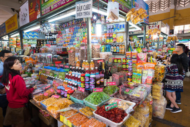 Здесь можно купить сувенирную продукцию, а также товары, которые чаще всего увозят путешественники домой из Вьетнама. К ним относятся: кофе, зеленый чай, продукты из артишоков, сухие и засахаренные фрукты. Интерес вызывают шелковые ткани, национальная одежда, аксессуары, косметика и бижутерия. Вьетнамцы, как и все азиатские народы, любят торговаться. Увидев туриста, они тут же завышают цены, но можно сбить стоимость, поторговавшись несколько минут. Далат славится производством вин. Благодаря местному виноделию Вьетнам был включен во всемирный «Атлас вин». Опытные путешественники советую обязательно приобрести бутылочку белого и красного местного вина.