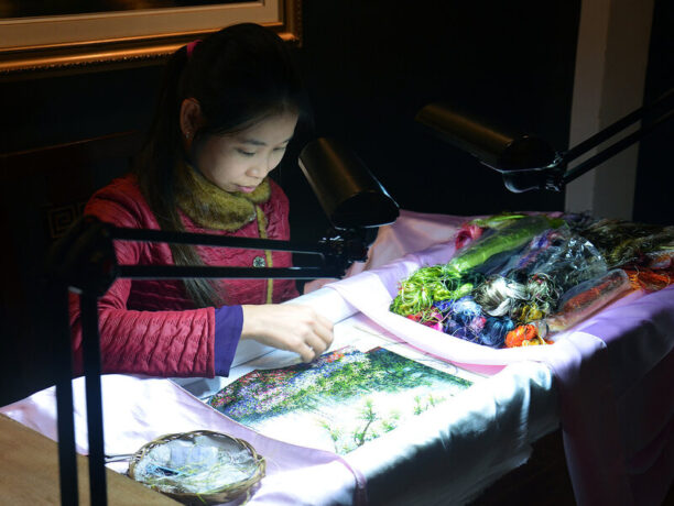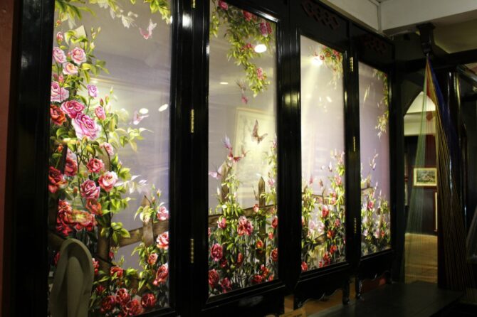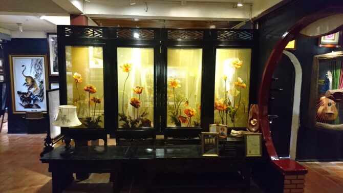 Отдельную комнату занимает экспозиция декоративных изделий из шелка. Здесь представлены картины, на которых изображены портреты, животные, местные пейзажи, цветы. Интерьер выполнен в традициях деревенского быта. Общий свет приглушен, но каждое произведение искусства выделено специальной подсветкой. Мастера художественной росписи по ткани выполняют изделия на заказ. Все экспонаты продаются. Их можно приобрести в качестве подарка или предмета декора для своего жилья.