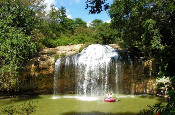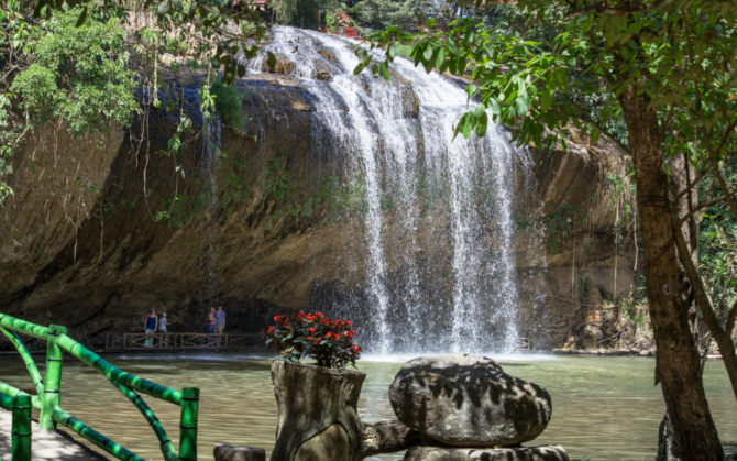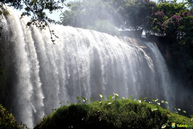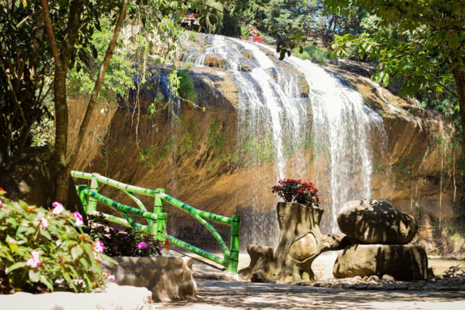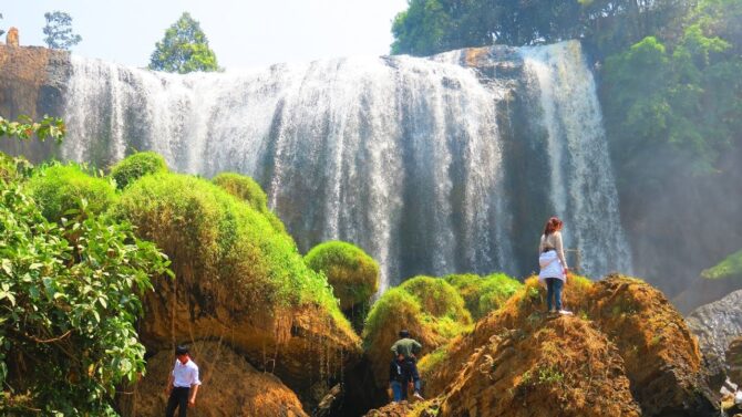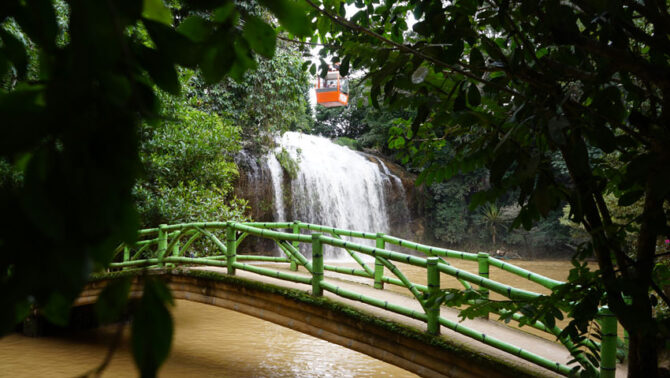 Все дорожки ведут к 20-метровому водопаду. У него есть своя особенность – проложенный мостик с поручнями, построенный за водным потоком. То есть можно посмотреть водопад снаружи и изнутри, а заодно сфотографироваться на фоне ниспадающей воды. На вершину водопада проложена небольшая канатная дорога. Цена билета – 15 тысяч донгов в одну сторону.