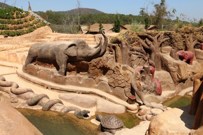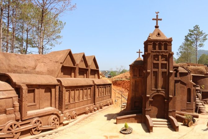 В 13 км от Далата на берегу озера Tuyen Lam в парковой зоне находится Глиняная древня. Это комплекс арт-объектов, сделанных из красной глины. Скульптуры рассказывают об истории Далата в своих работах. Среди них – макеты старого ж/д вокзала, здания университета и самого фешенебельного отеля города «Palace Hotel». Здесь рядом с колесницей, запряженной двумя ретивыми конями можно увидеть огромный дисковый телефон, бобинный магнитофон, а также послушать песню в исполнении уличных музыкантов на фоне гитары и саксофона. В конце узкого туннеля находится дом. Он построен из глины и все его интерьеры выполнены из этого материала. На территории парка есть уникальное искусственное озеро. Оно представляет собой лица мужчины и женщины, смотрящих друг на друга. Здесь есть, чем полюбоваться и на фоне чего сфотографироваться.