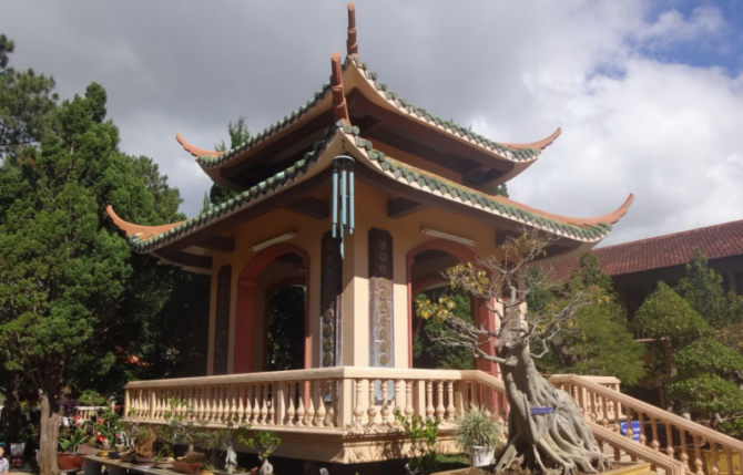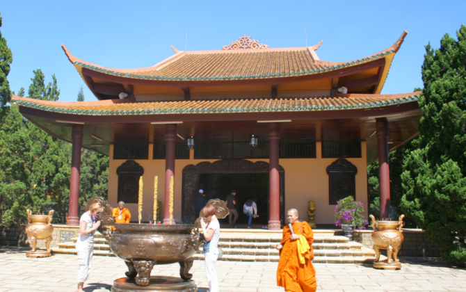 На пешую прогулку от центра Далата до стартовой станции канатной дороги уйдет около 40 минут. Но сама дорога ничего интересного не представляет, поэтому лучше взять в отеле велосипед или заказать такси. На станции обустроена смотровая площадка, откуда открывается вид на весь город. Билеты продаются в кассе. Если брать в обе стороны, то выйдет дешевле. Подъем до монастыря длится около 15 минут. Следует уточнить, что туристов обычно привозят сюда на автобусе, канатная дорога в экскурсию не входит. Стоит проявить инициативу и обязательно полюбоваться местными красотами, пролетев над ними в кабинке подъемника. Как и во всех монастырях, одна его половина открыта для посещения, вторая доступна только монахам. В центре построена красивая пагода, внутри которой установлен 2-метровый Будда, для обозрения выставлен большой бронзовый колокол. В конце экскурсии можно пройтись по сосновому бору, отдохнуть в одной из беседок.
