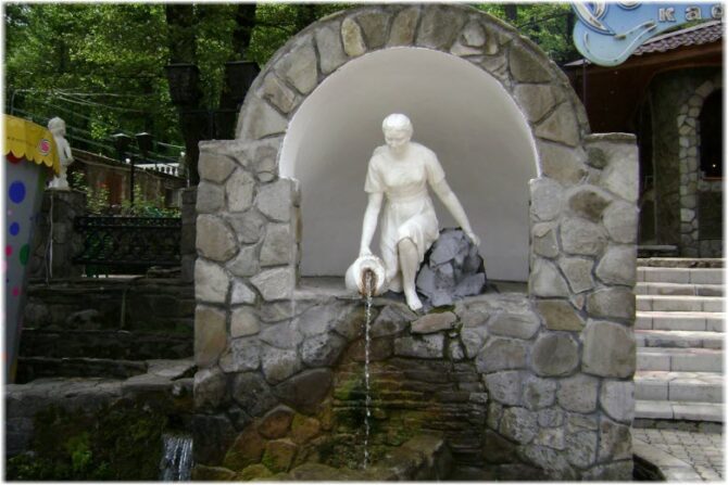 Вечерами здесь включается подсветка, превращающая весь комплекс в сказочное место. Жанровая скульптура девушки защищена от дождей широким навесом. Из кувшина, который она держит в руках, льется вода источника. Имя Наташи связано с несколькими легендами. Одно из наиболее правдоподобных преданий рассказывает о любви Наташи и Бекира – русской девушки и адыгейского воина.