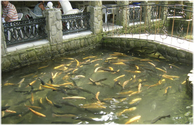 - пруд, в котором плавают осетры и форели;
