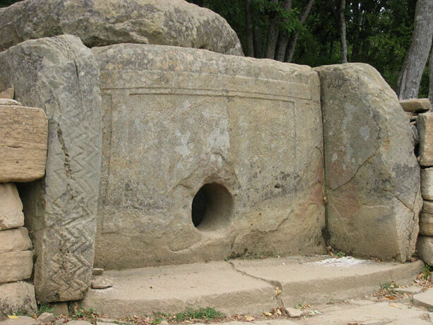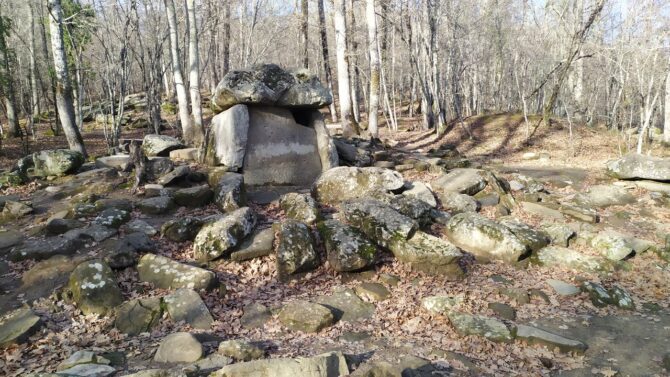 Чуть дальше в лесу находится еще один дольмен, гораздо хуже сохранившийся. Путь к монолиту проходит среди холмов и насыпей. Возраст кавказских дольменов – от 3,4 до 4,7 тыс. лет. По предположению ученых, каменные столбы – так можно перевести слово «дольмены» с бретонского языка – выполняли роль культовых сооружений или захоронений вождей и жрецов.