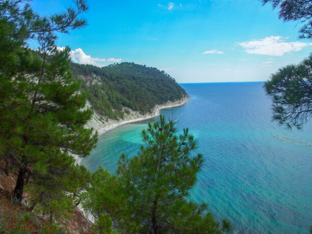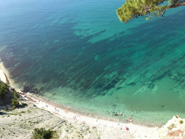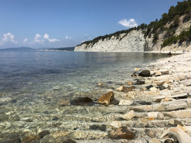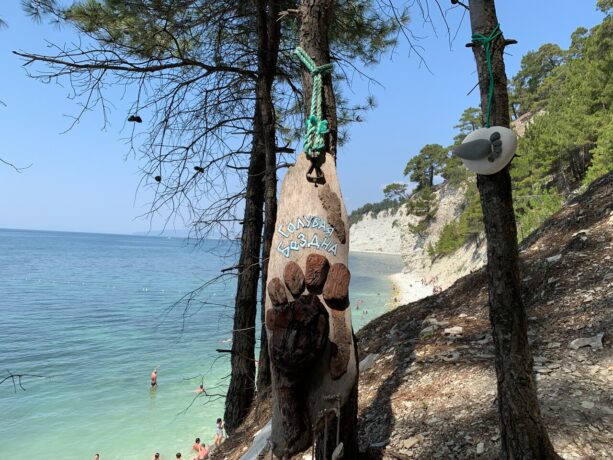 Вдоль лагуны, окруженной обрывистыми берегами (высота – 20–50 м), поросшими ветвистыми пицундскими соснами, протянулась узкая полоса галечного пляжа. От автострады по склону холма идет грунтовая дорога к морю. Непосредственно к пляжу можно спуститься по многоступенчатой деревянной лестнице.