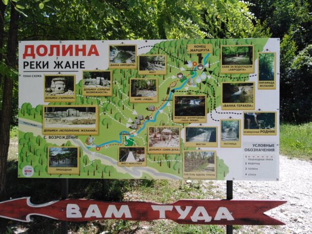 Туристы, увлеченные эзотерикой, и не только они приезжают в это место, расположенное на реке Жане, чтобы зарядиться позитивной энергией. В живописной долине расположены две поляны. На первой из них находятся три дольмена: два круглых составных и один квадратный монолитный. Здесь же в летние месяцы туристы устанавливают палатки. Для любителей природы, посещающих «место силы», работают кафе и сувенирные лавки.